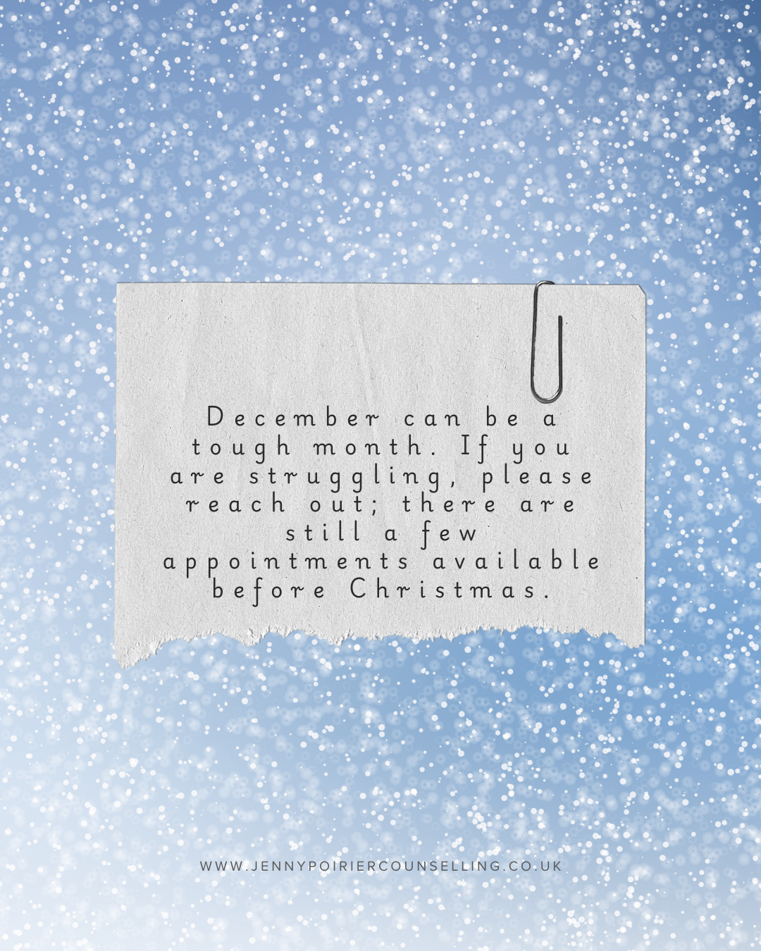 December can be a tough month. The short hours of daylight can exacerbate depression and feelings of isolation. You may feel stressed at the thought of spending time with relatives or the financial cost of the festive season. We may especially feel the absence of loved ones at this time of year. Counselling can help you manage stress, lessen feelings of isolation and give you support. If you are struggling please reach out, there are still a few appointments available before Christmas.